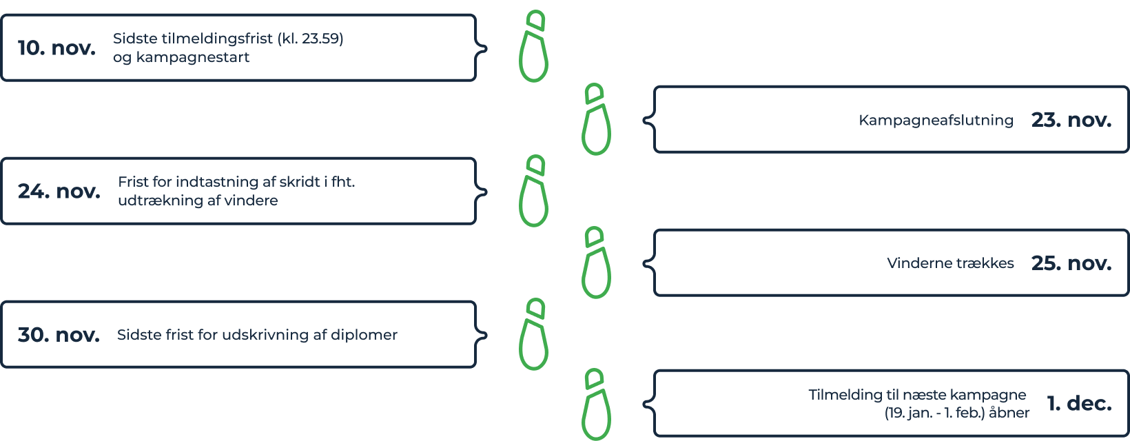 Kampagnen varer to uger hver gang, og for hver 10.000 skridt en deltager på holdet går, optjener han/hun 1 lod til holdet. Alle hold, der har optjent min. 1 lod deltager i lodtrækningen om pengepræmierne. Hver deltager vil maksimalt kunne indsamle 14 lodder til holdet svarende til, at man går i gennemsnit 10.000 skridt om dagen i kampagnens 14 dage.
